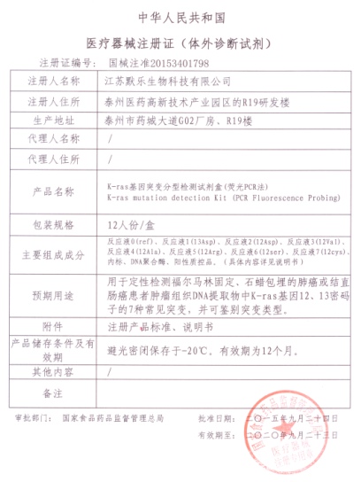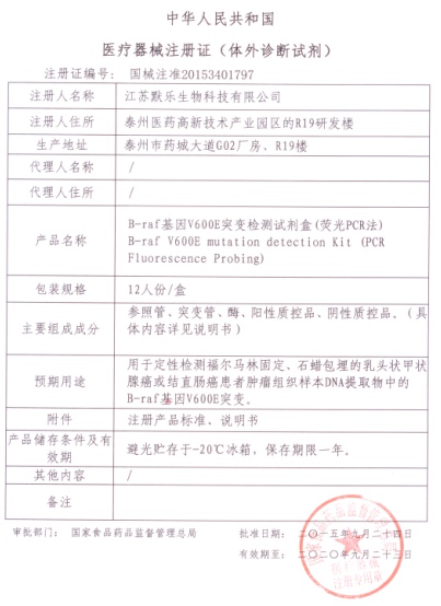 日前,我公司用于肿瘤个性化检测的两个新品——K-ras基因突变分型检测试剂盒(荧光PCR法)和B-raf基因V600E突变检测试剂盒(荧光PCR法,获得国家食品药品监督管理总局的批准,顺利领到注册证,标志着我公司的产品已从传染病检测领域逐步扩展到肿瘤个性化检测领域。至此,我公司共拥有注册证22个,其中三类证16个。