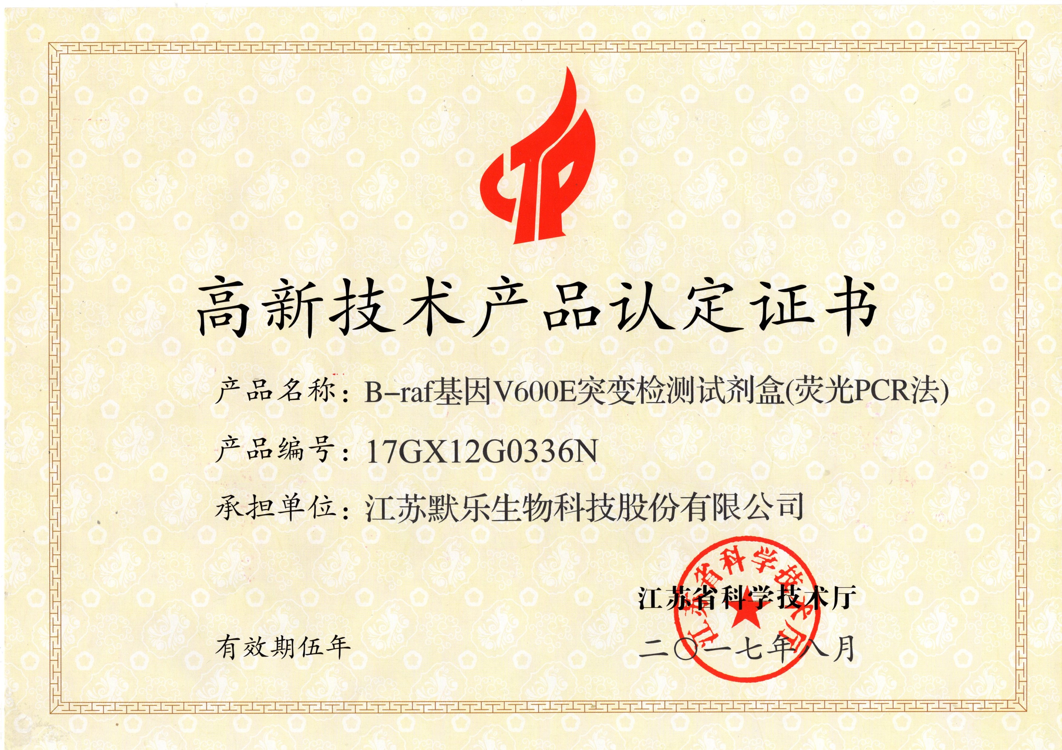 日前,从有关部门获悉,我公司产品“B-raf基因V600E突变检测试剂盒(荧光PCR法) ”(国械注准20153401797)被江苏省科学技术厅认定为高新技术产品。该产品主要用于肿瘤特异性癌基因B-raf V600E突变检测,可用于肿瘤的个体化分子诊断,进而指导肿瘤患者的临床个体化治疗方案,具有特异性强、准确性高、敏感度优、操作简捷等特点,是国内同类产品的佼佼者。