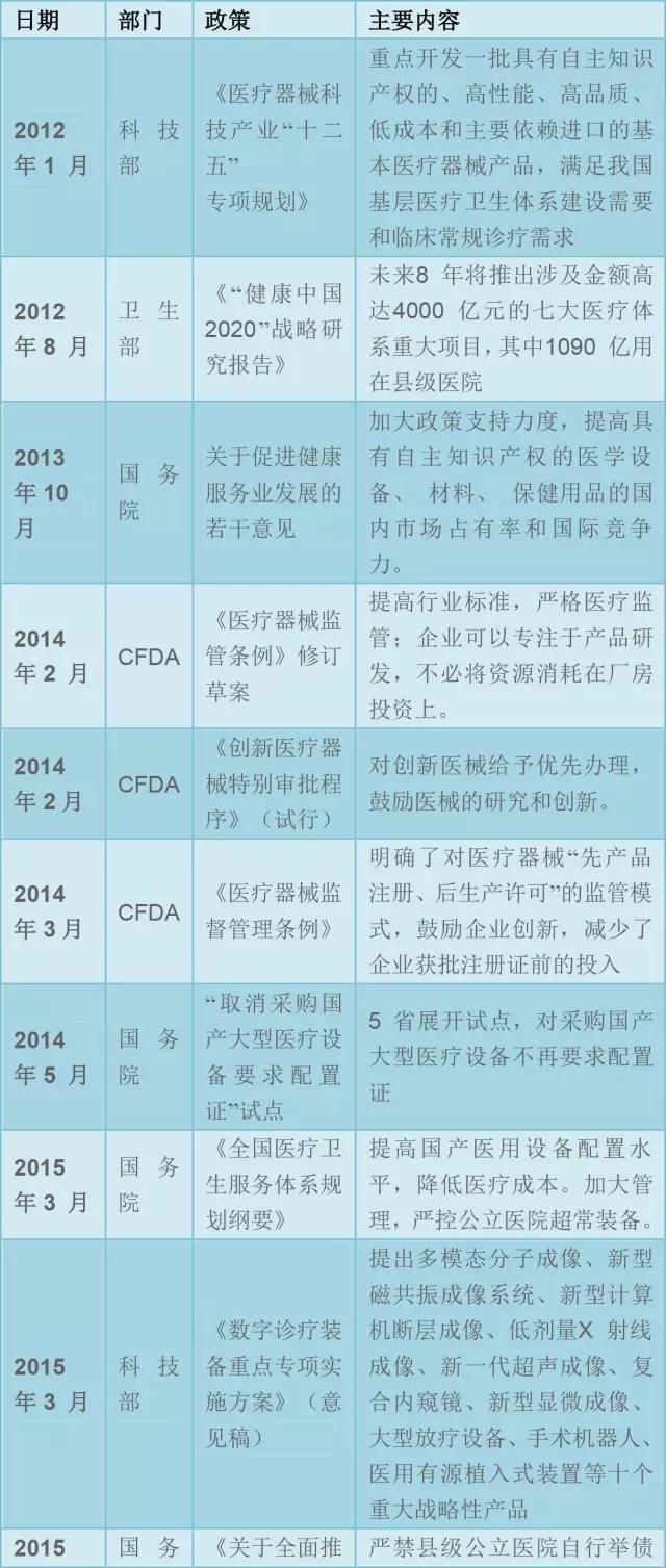 鼓励创新:以《中国制造2025》和《关于积极推进“互联网+”行动的指导意见》为核心的系列政策重点关注高端影像设备、可穿戴设备、医疗机器人、互联网+医疗等方面,旨在鼓励我国医疗器械行业向科技创新发展,彻底摆脱过去依靠低端产品获取微薄利润的产业链底部位置。