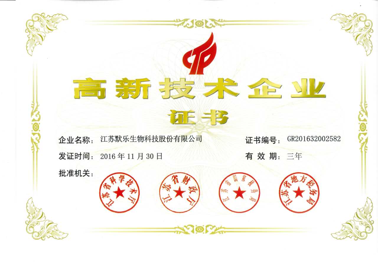 日前,公司再次从政府有关部门领回了由江苏省科技厅、财政厅、国税局、地税局颁发的“高新技术企业”证书。早在