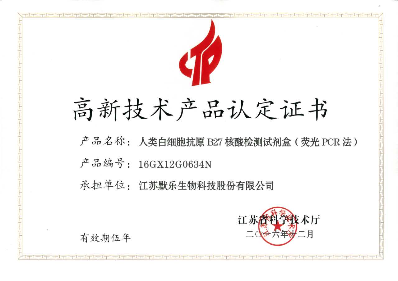 新年刚过,公司捷报频传,继获得“高新技术企业”称号后,申报的三个产品又被江苏省科技厅批准为“江苏省高新技术产品”,这三个产品分别为:肺炎支原体核酸耐药突变位点检测试剂盒(荧光PCR法)、人类白细胞抗原B27核酸检测试剂盒(荧光PCR法)和K-ras基因突变分型检测试剂盒(荧光PCR法)。这三个产品在国内均处于领先水平,甚至填补国内空白。至此,我公司获得“江苏省高新技术产品”称号的产品已达六个,标志着PA直营生物在科技创新之路上又攀上了新的高峰。