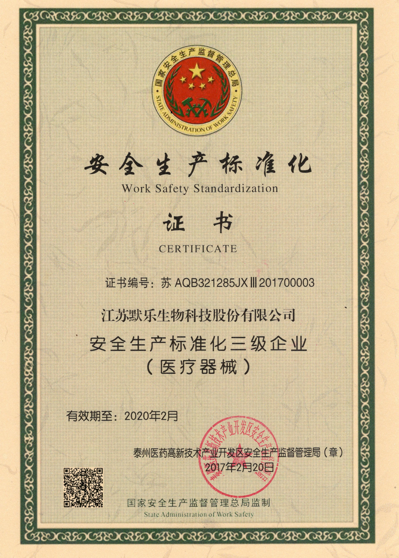 日前,泰州医药高新技术产业开发区安全生产监督管理局向我司颁发了“安全生产标准化证书”,认定我司为“安全生产标准化三级企业(医疗器械)”。今年1月,我司刚刚被园区管委会授予“安全生产工作先进企业”。此次通过安全生产标准化认证,标志着我司在安全生产管理方面又迈上了新的台阶。